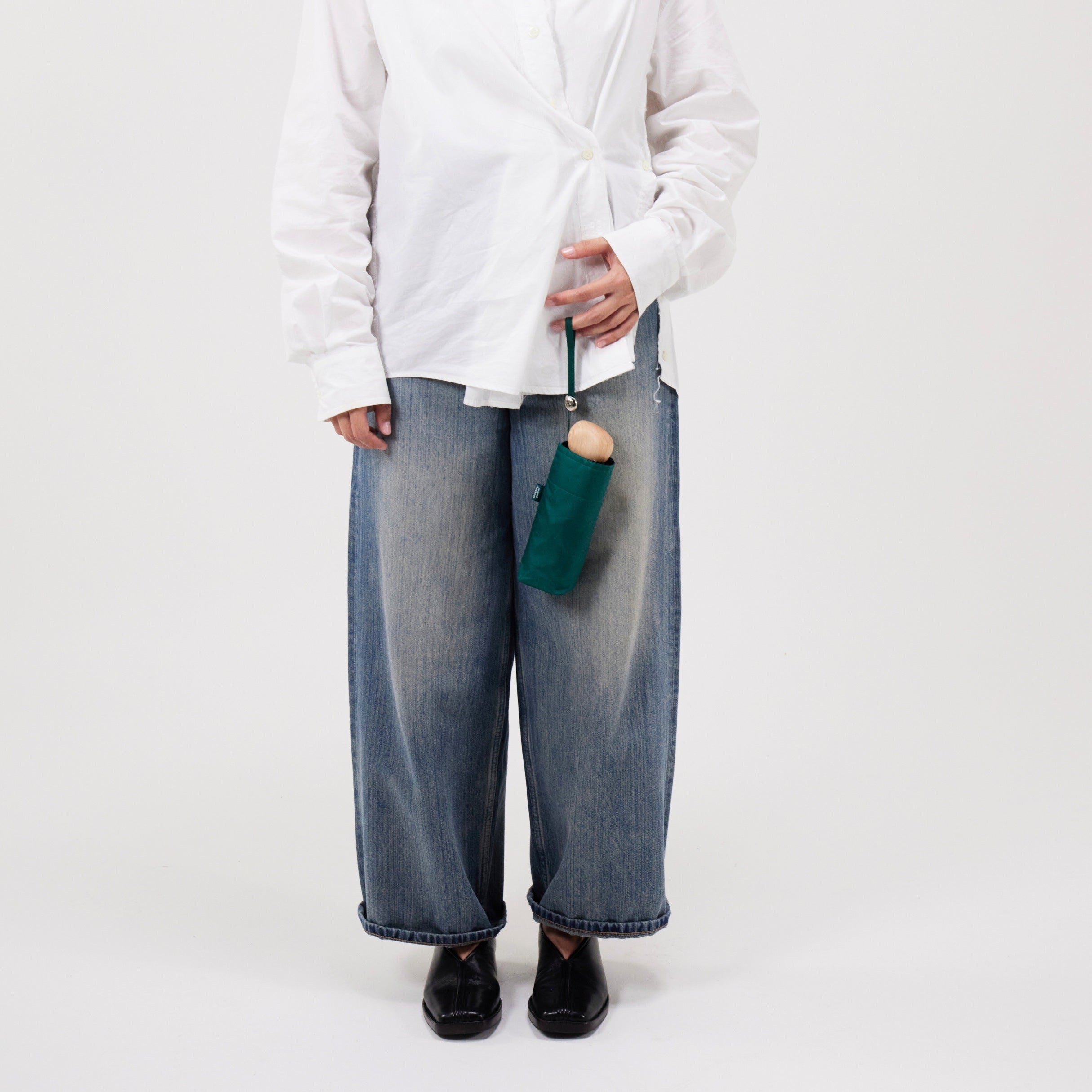 • Person wearing a white shirt and blue jeans holding a mini green umbrella on a plain background