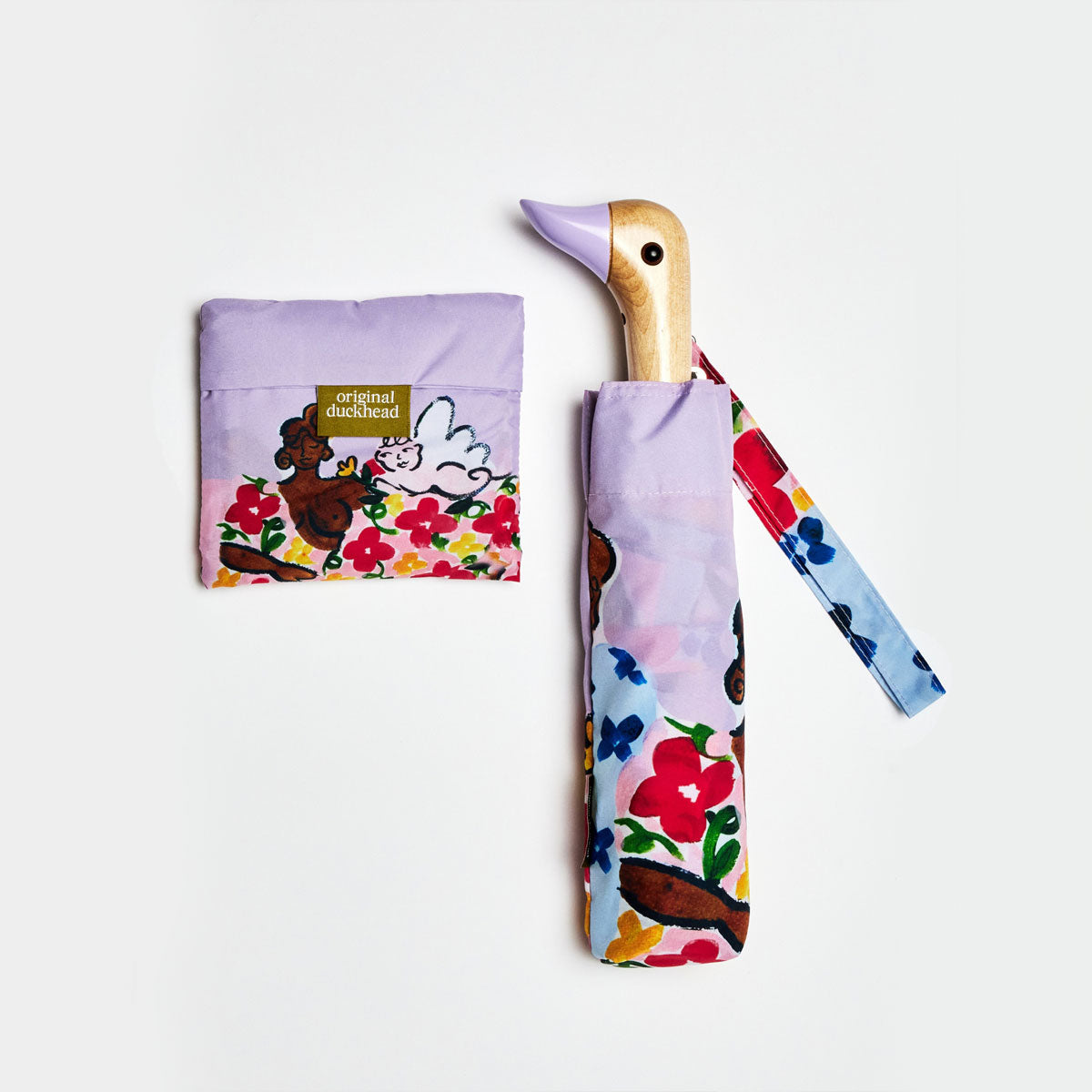 • Floral-patterned umbrella with a duckhead carved wooden handle and matching pouch on a white background