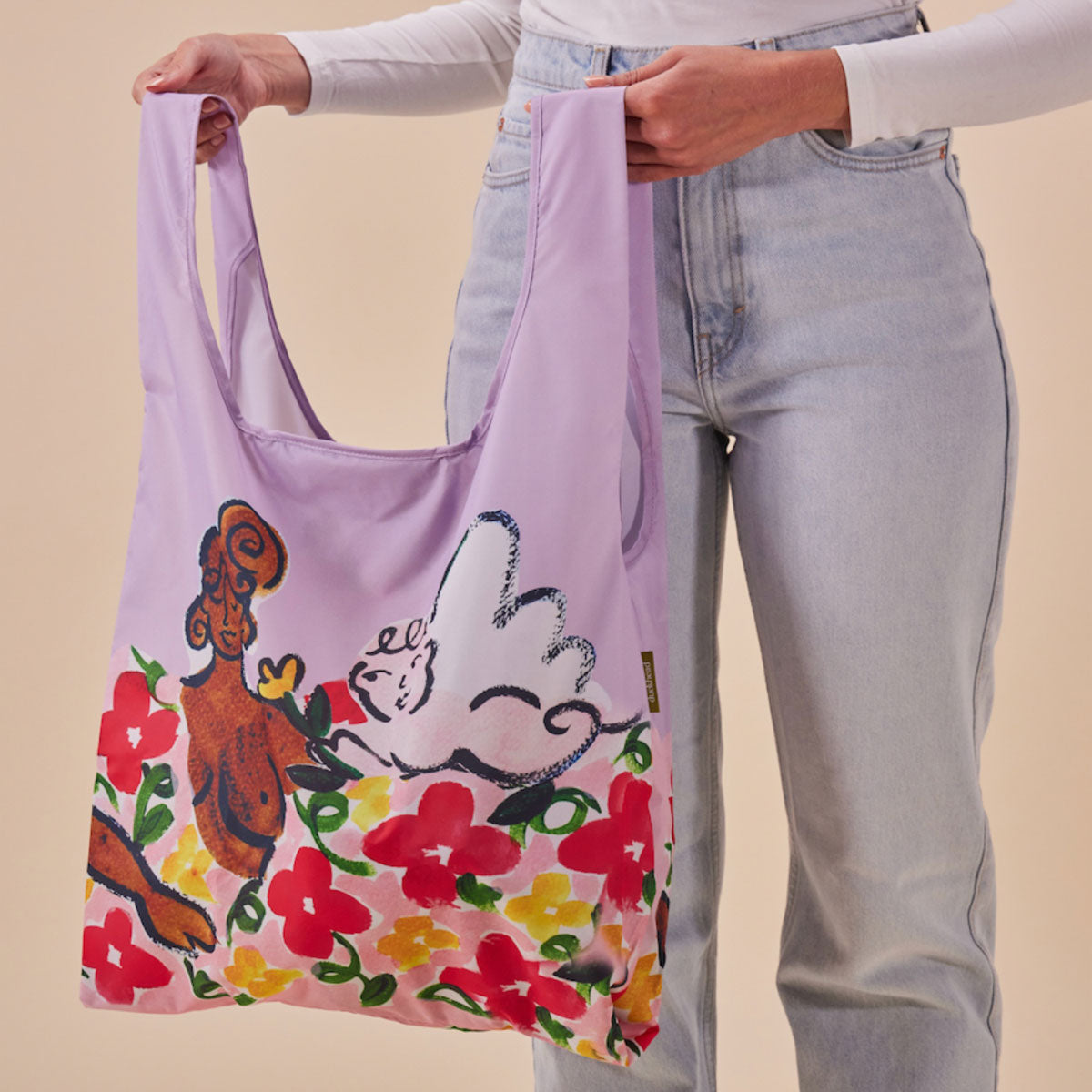 • Person holding a colorful tote bag with characters and flowers against a beige background