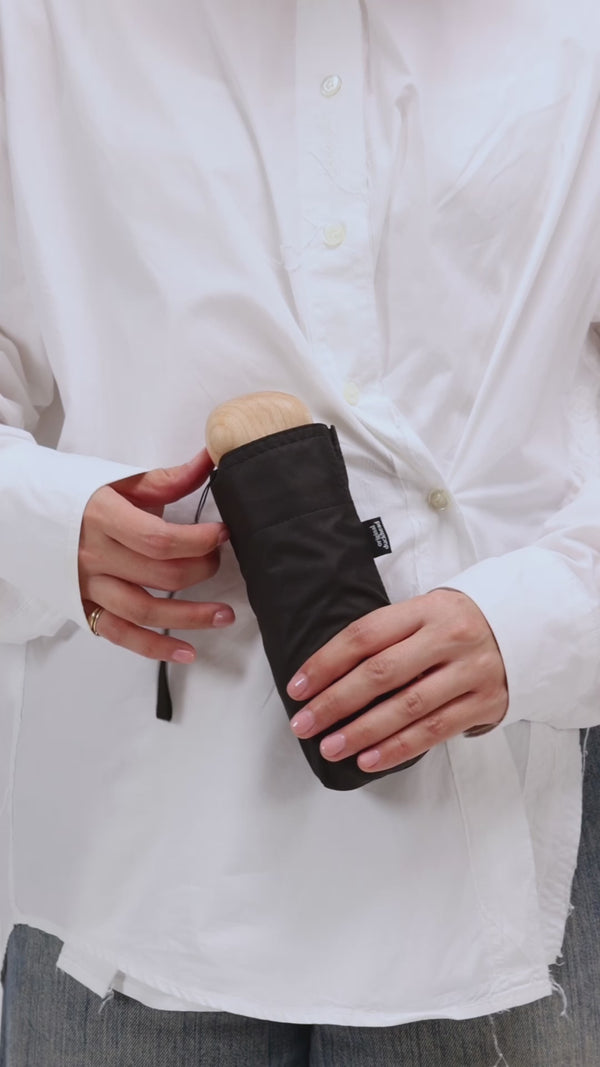 The canopy is made from 6 post-consumer recycled plastic bottles and finished with a sustainably sourced birch wood handle shaped like a smooth pebble for a comfortable grip. In a classic black shade that never goes out of style, this versatile umbrella pairs effortlessly with any look, season after season. Finished with a sleek silver metallic hardware and available in versatile colours, The Mini umbrella ends the compromise between style and function.