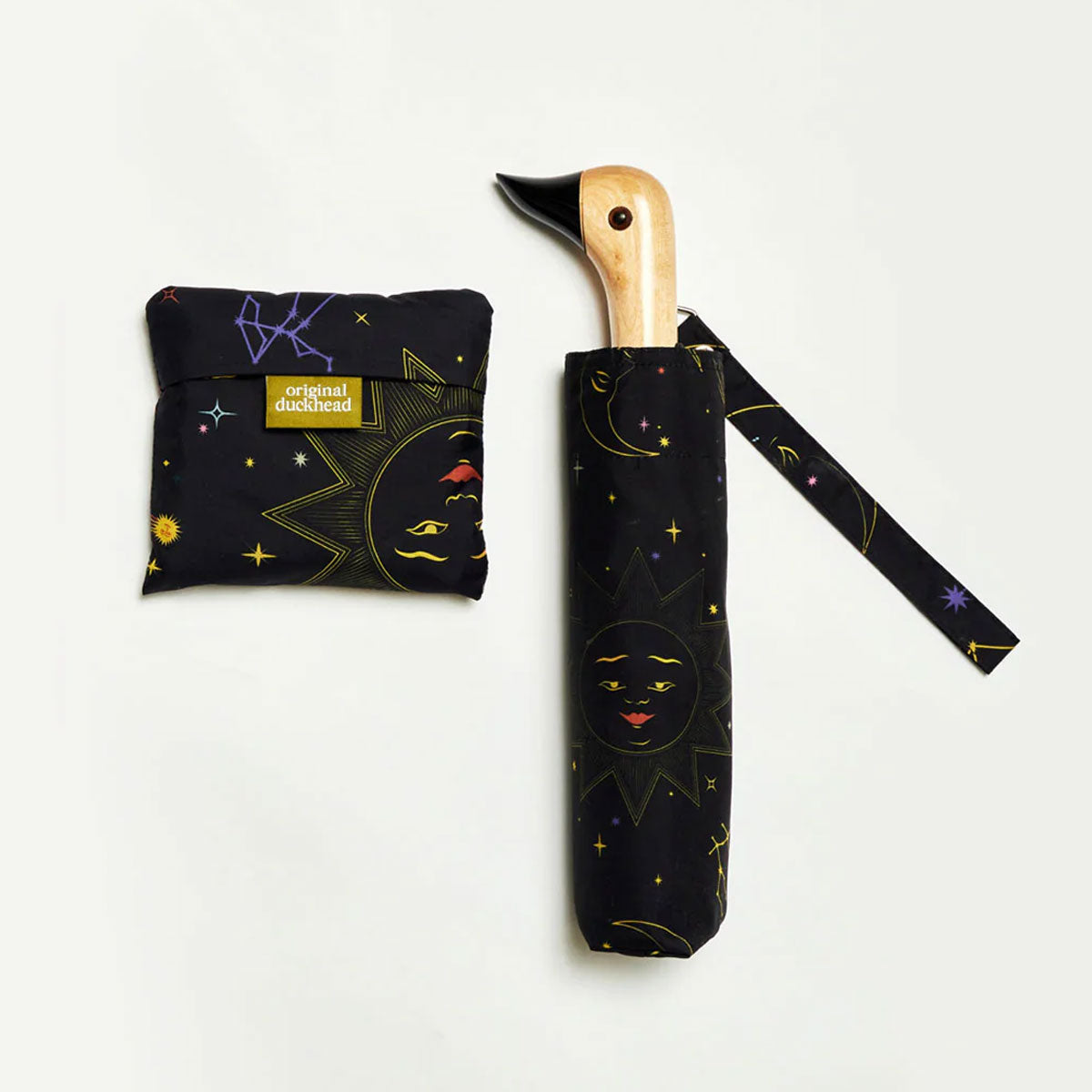 • Black umbrella with celestial design and duckhead wooden handle on a white background