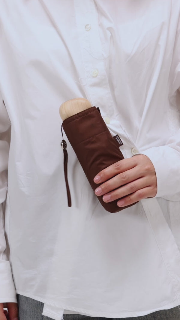 The canopy is made from 6 post-consumer recycled plastic bottles and finished with a sustainably sourced birch wood handle shaped like a smooth pebble for a comfortable grip. In a rich espresso brown shade that radiates warmth and sophistication, this elegant umbrella adds understated style to every outing. Finished with a sleek silver metallic hardware and available in versatile colours, The Mini umbrella ends the compromise between style and function.