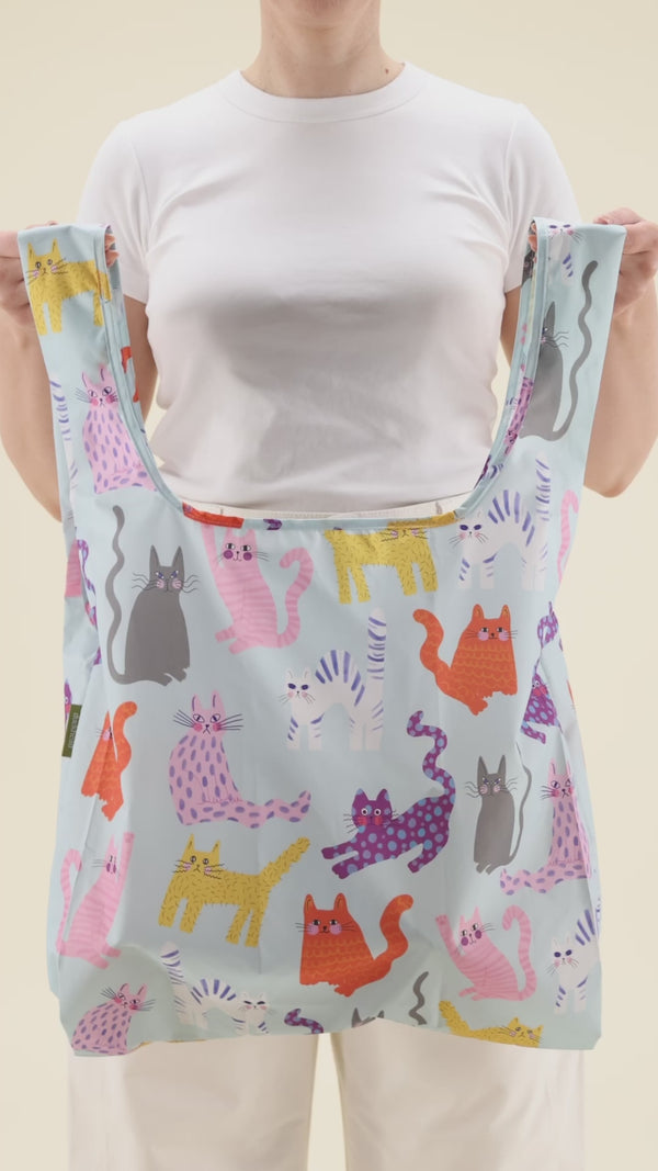 Lightweight yet ultra strong, it carries everything from your daily groceries to weekend getaways - then folds neatly away when not in use. With its charming cat print on a soft sky-blue background, it’s the perfect eco gift for cat lovers and a must-have for anyone who adores playful, sustainable style.