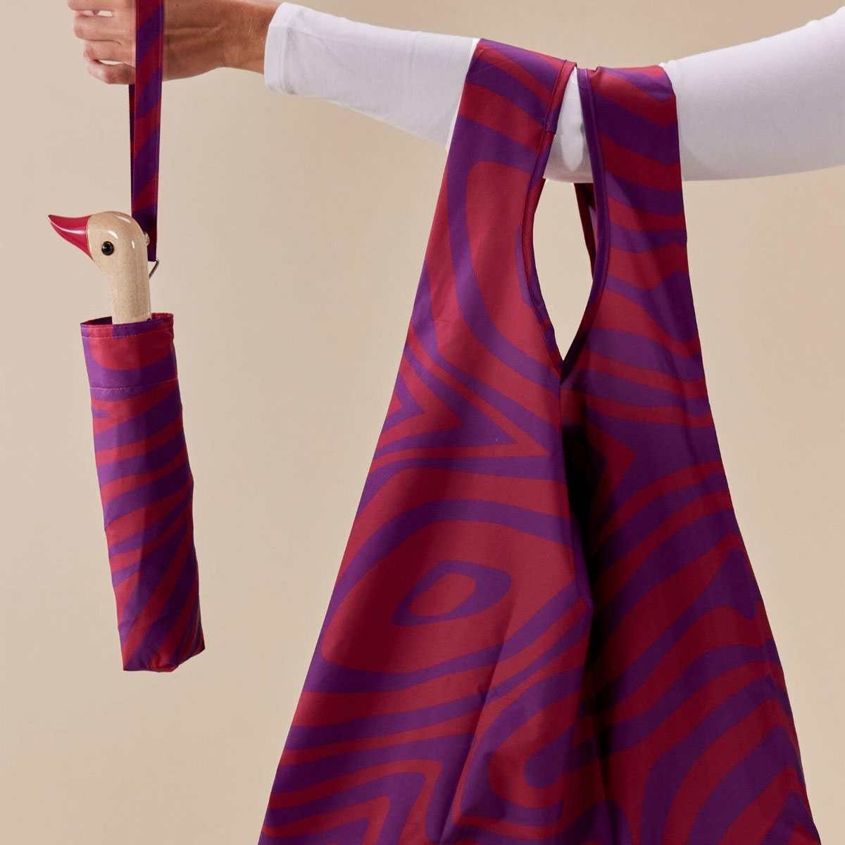 This bundle includes a matching pink umbrella and tote made from recycled bottles. Beautifully coordinated, joyfully sustainable.